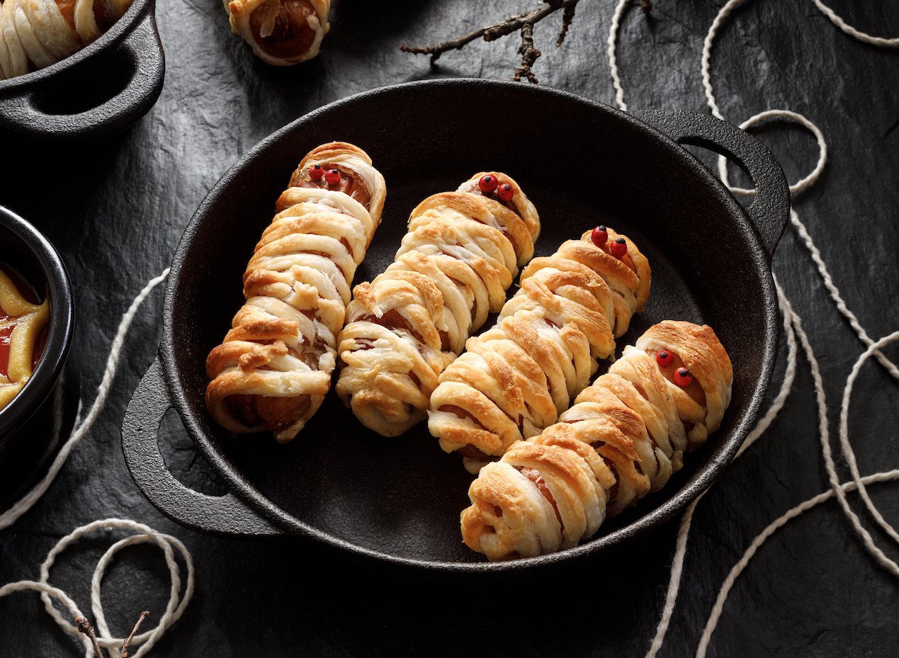Momias de hojaldre_ Puedes elegir cualquier ingrediente para realizar esta receta, porque el hojaldre trenzado sobre queso, jamón, salchicha etc da aspecto de momia así que úsalo en un sin fin de recetas y déjate llevar por la imaginación.
